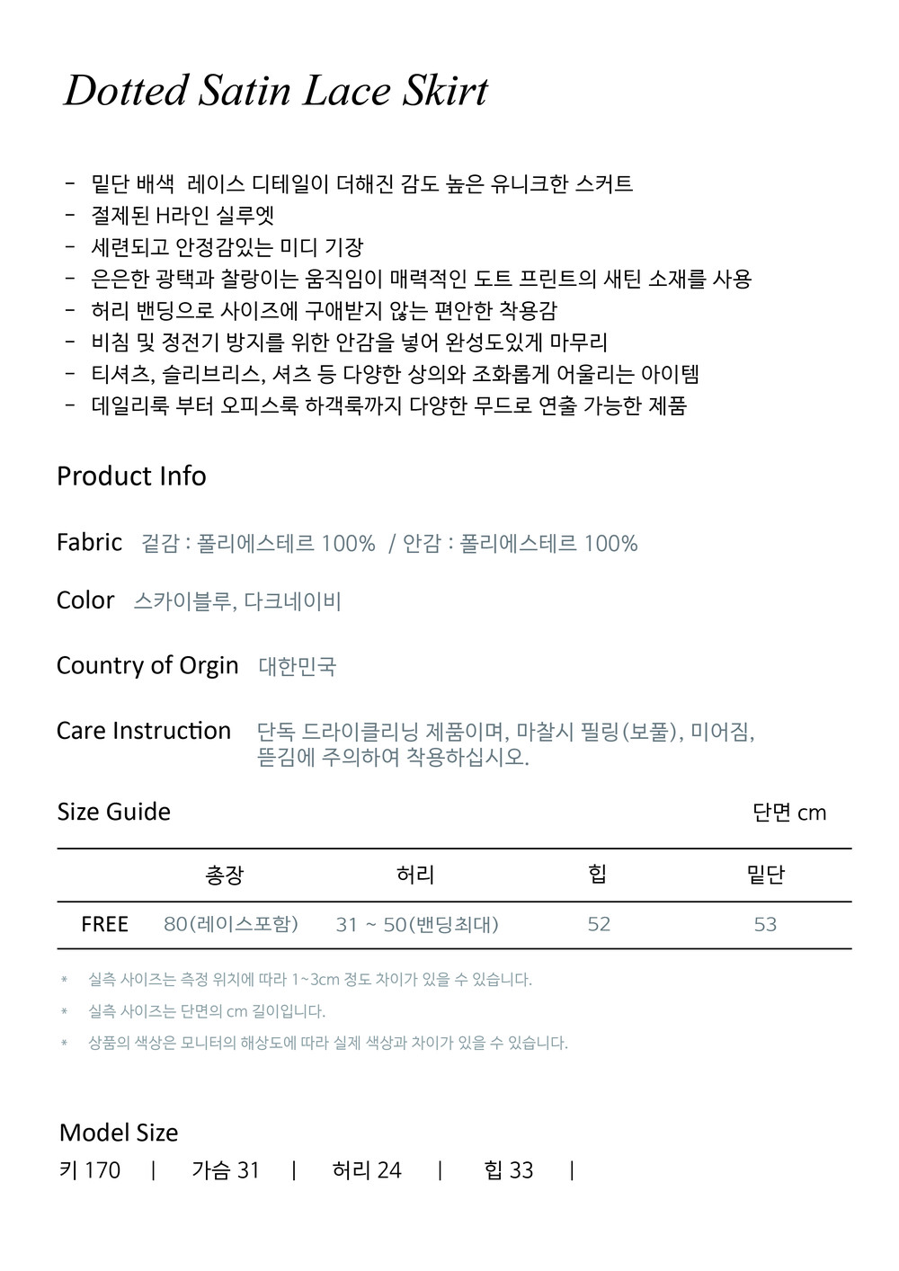 - 사이즈는 측정 방법에 따라 1-3cm 정도 차이가 날 수 있으며, 체형에 따라 핏이 다를 수 있습니다.