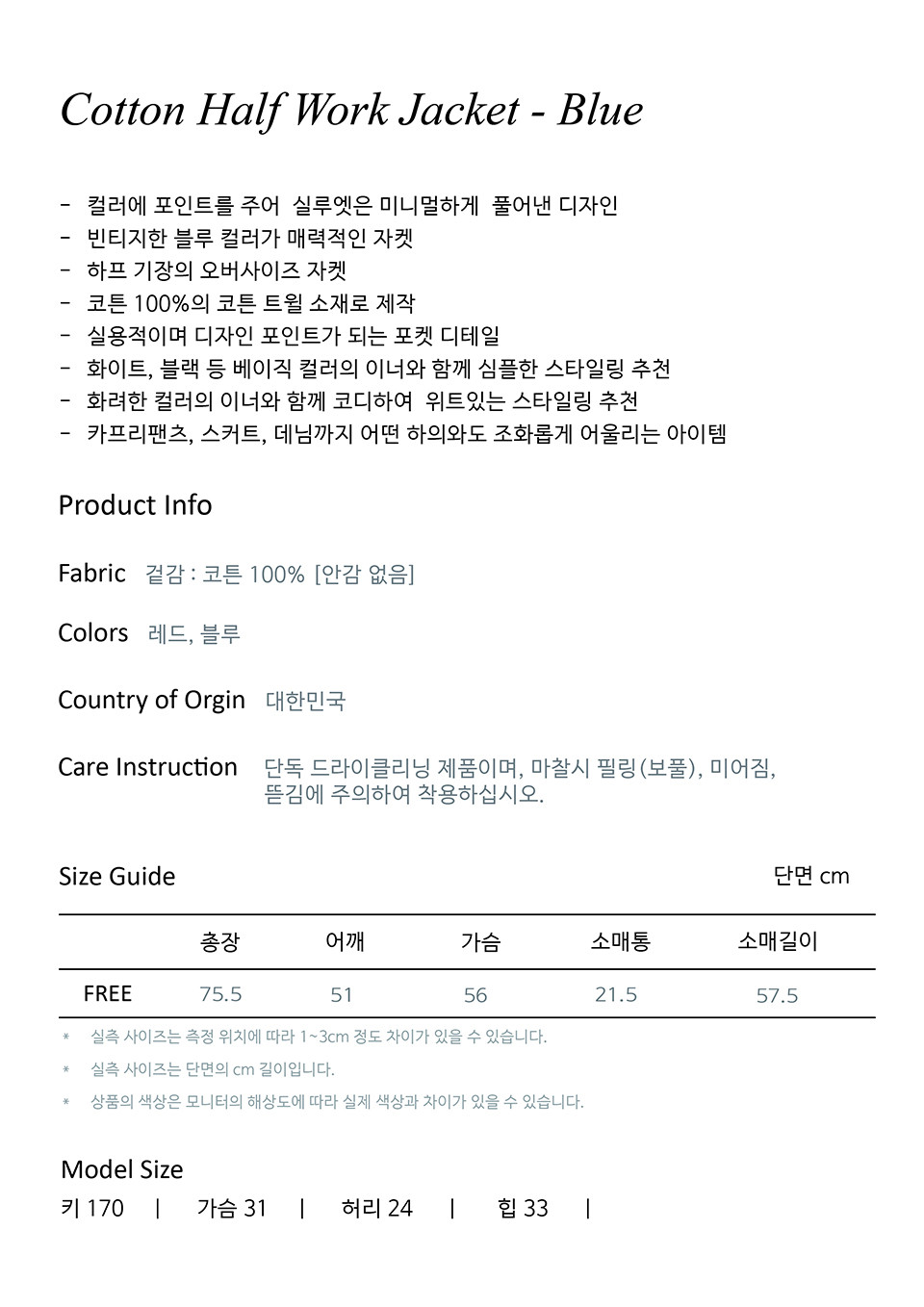 - 사이즈는 측정 방법에 따라 1-3cm 정도 차이가 날 수 있으며, 체형에 따라 핏이 다를 수 있습니다.