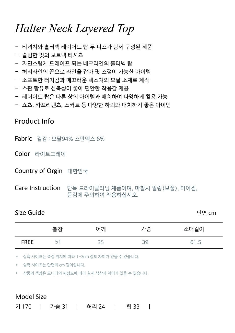 - 실제 상품 컬러는 모델 착용 사진과 가장 유사합니다.