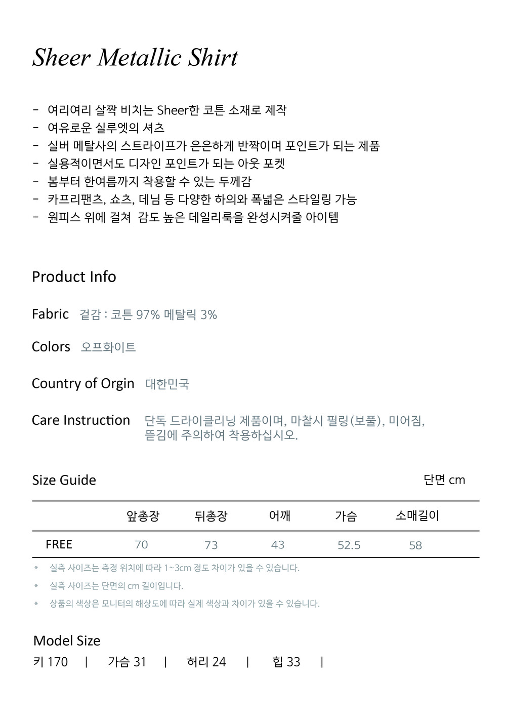 - 사이즈는 측정 방법에 따라 1-3cm 정도 차이가 날 수 있으며, 체형에 따라 핏이 다를 수 있습니다.
