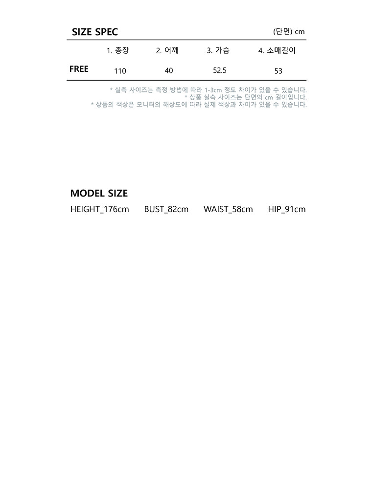- 사이즈는 측정 방법에 따라 1-3cm 정도 차이가 날 수 있으며, 체형에 따라 핏이 다를 수 있습니다.