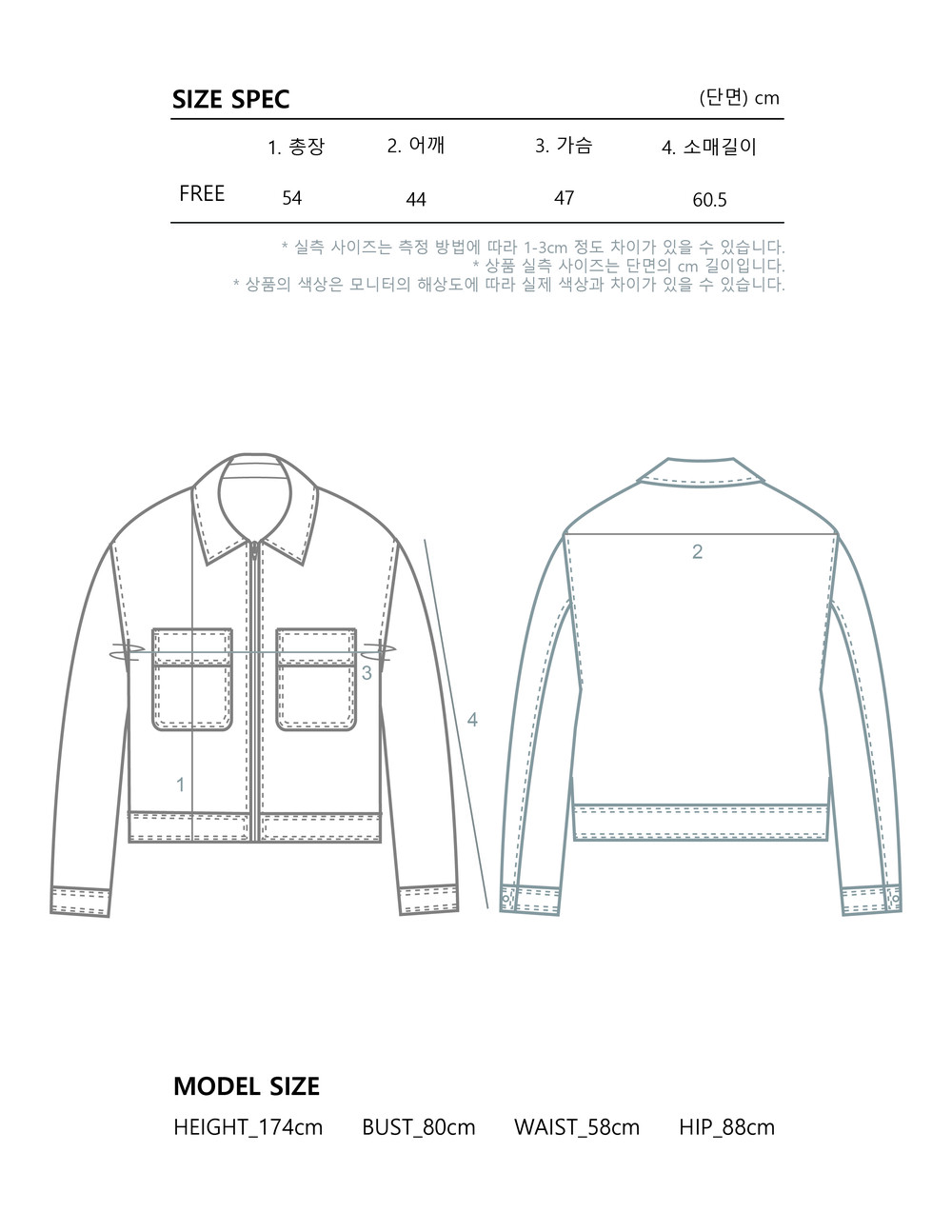 - 사이즈는 측정 방법에 따라 1-3cm 정도 차이가 날 수 있으며, 체형에 따라 핏이 다를 수 있습니다.