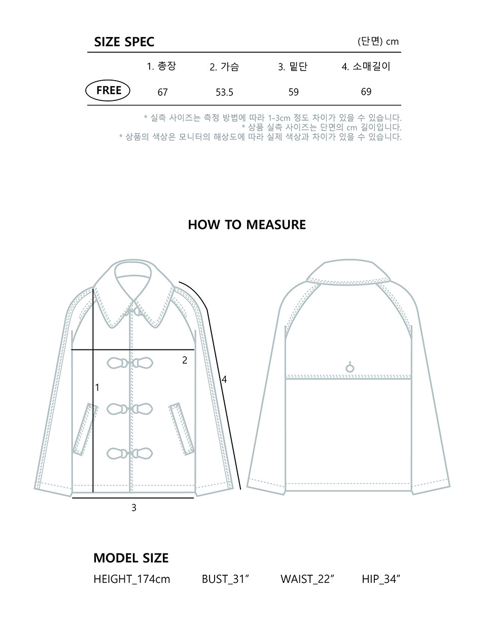 - 사이즈는 측정 방법에 따라 1-3cm 정도 차이가 날 수 있으며, 체형에 따라 핏이 다를 수 있습니다.
