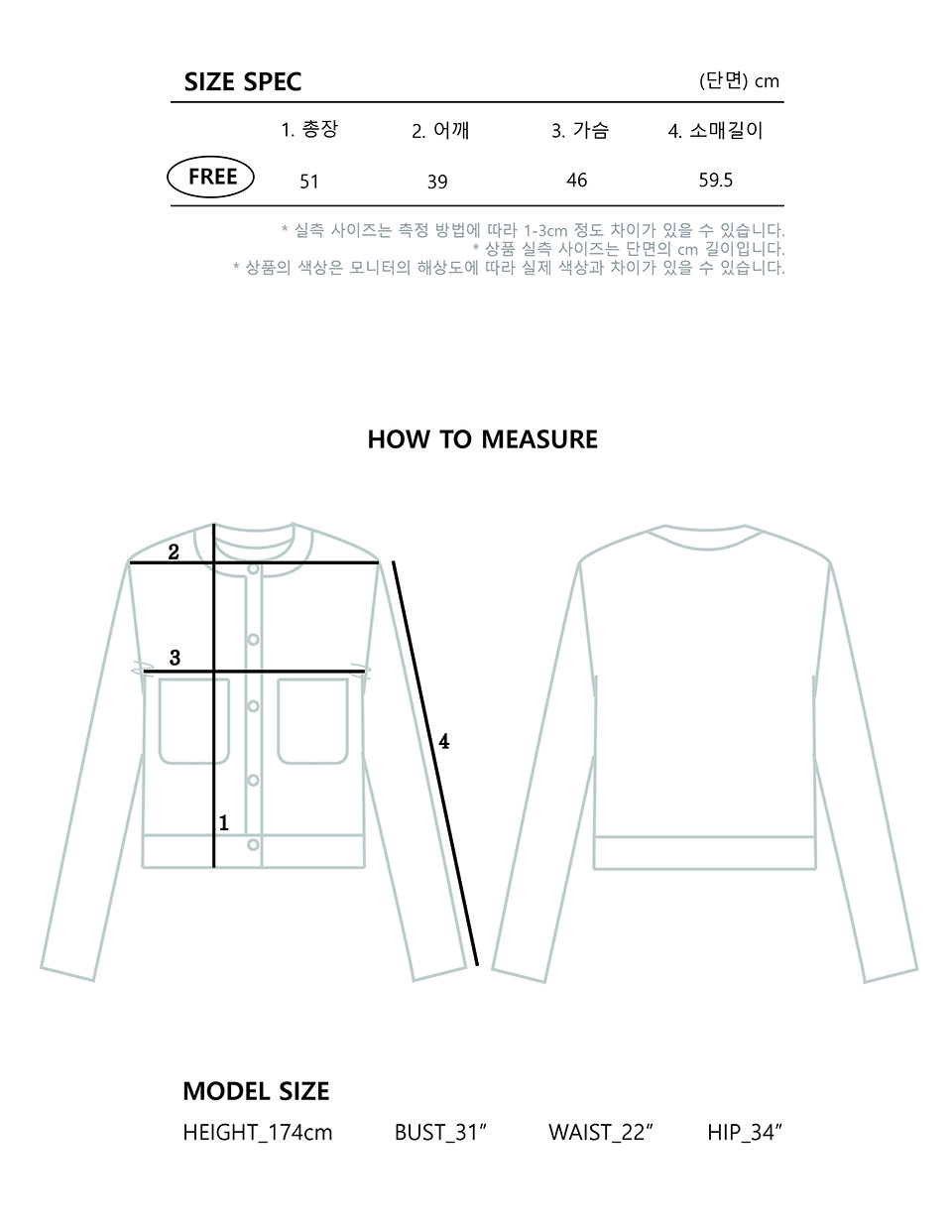 - 사이즈는 측정 방법에 따라 1-3cm 정도 차이가 날 수 있으며, 체형에 따라 핏이 다를 수 있습니다.