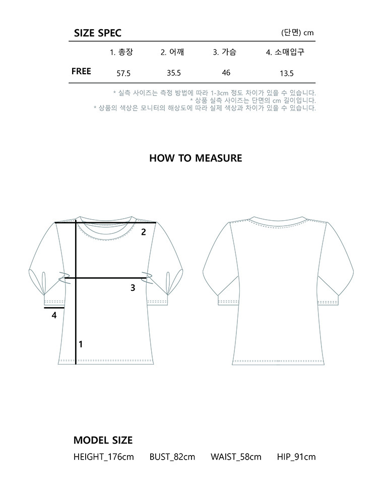 - 사이즈는 측정 방법에 따라 1-3cm 정도 차이가 날 수 있으며, 체형에 따라 핏이 다를 수 있습니다.