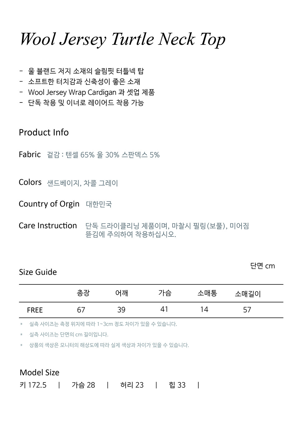 - 사이즈는 측정 방법에 따라 1-3cm 정도 차이가 날 수 있으며, 체형에 따라 핏이 다를 수 있습니다.