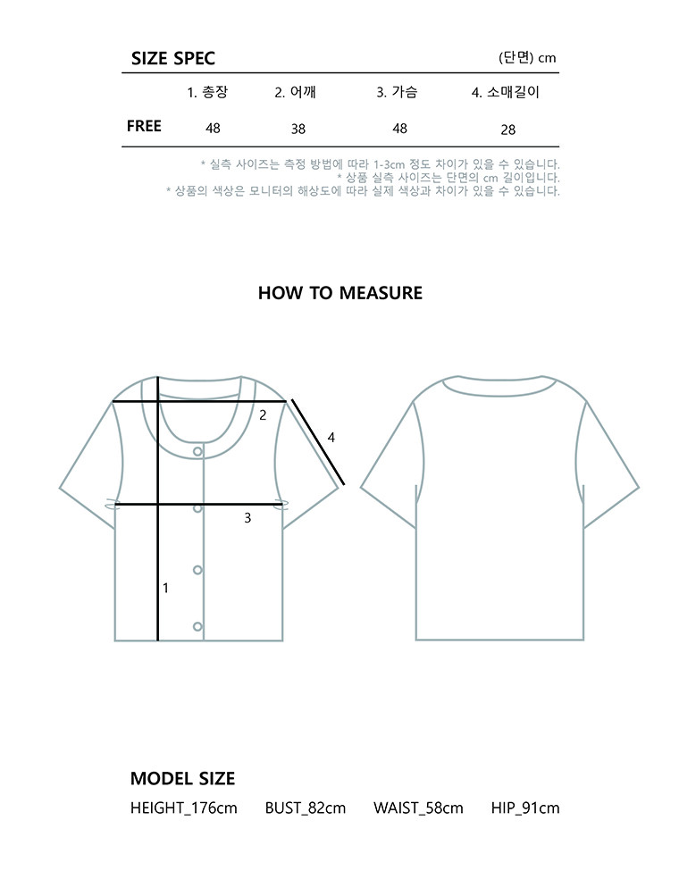 - 사이즈는 측정 방법에 따라 1-3cm 정도 차이가 날 수 있으며, 체형에 따라 핏이 다를 수 있습니다.