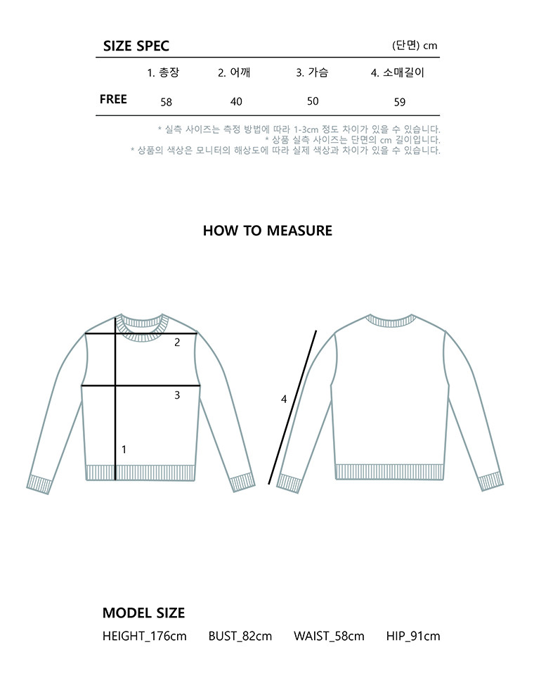 - 사이즈는 측정 방법에 따라 1-3cm 정도 차이가 날 수 있으며, 체형에 따라 핏이 다를 수 있습니다.